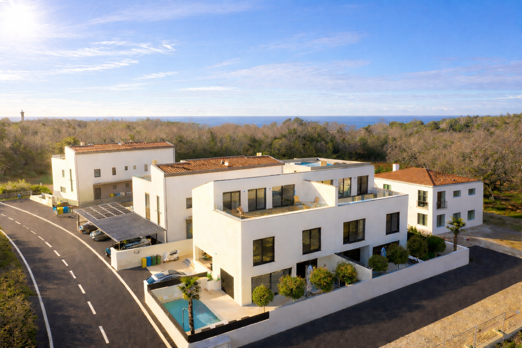 Prodaja se luksuzna vila dvojček z bazenom v mirnem naselju v Bašaniji le streljaj od morja.